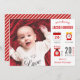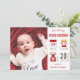 Modern birth announcement card featuring cute infographic elements and modern typography against a white background. Add all your lovely details on this easy-to-use template and adorn this card with your baby's photo to make it a one-of-a-kind announcement. Flip the card over to reveal a red and white stripes pattern on the back of the card.