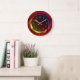 Pretty bright colorful neon clock face on a red metallic look background, with green neon numbers. Fun clock for any room, office or dorm. ALL DESIGN ELEMENTS ARE PRINTED NO ACTUAL NEON GLOW OR METALLIC.