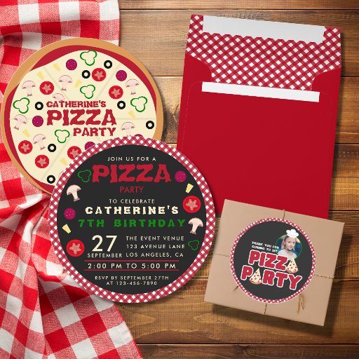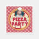Celebrate your kid's birthday in delicious fun style with a pizza-themed party! This pizza themed birthday napkin features a colorful illustration of a pizza with toppings that create a festive and inviting atmosphere. The background has been designed to resemble a checkered red and white tablecloth, which is often associated with pizza restaurants. Additionally, playful and funny chef cap custom photo makes this design more fun and inviting. Overall, this pizza themed birthday design is a unique and creative way to get guests excited about the upcoming celebration.
