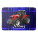 A farmer's favorite red tractor is over a modern blue background on this fun design.