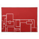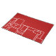 Modern red and white placemat features a stylish minimalistic abstract design of a geometric pattern of white lines, rectangles, and squares on a red background. The white abstract pattern is positioned at the bottom half of the red placemat, leaving plenty of open space to create that minimalistic look and feel.