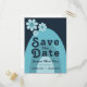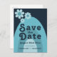 Bold blue modern groovy retro 70s vintage wedding save the date invitation. Three Cool retro minimalist daisies with rainbow arch design in dark navy blue, dusty blue and blush blue. This fun hippy save the date card is easy to personalize using the simple templates with groovy typography. Ideal for setting the tone for a summer spring or autumn wedding. Original artwork by artist Catherine Sweetman