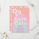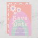 Bold modern groovy retro 70s pastel colors wedding save the date invitation. Cool retro minimalist daisy pattern with rainbow arch design in orange peach pink green and liliac lavender purple. This fun hippy save the date card is easy to personalize using the simple templates. Ideal for setting the tone for a summer spring or autumn wedding. Original artwork by artist Catherine Sweetman