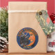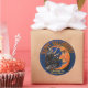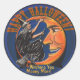 These glossy round stickers feature Leslie Sigal Javorek's modern retro update to a funny 1950’s Halloween graphic of a laughing witch yanking the hairs of a grinning man-in-the-moon. Arched above them is the greeting "Happy Halloween" in an orange bone shaped font & all set on a midnight blue background. Punny (funny+pun) Caption at bottom "& Witching You Moony More!" can be kept, personalized or cleared.