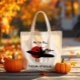 Halloween joke tote bag with a witch flying a propeller airplane with her cat in front of a blood red moon. Time for a broom upgrade.
