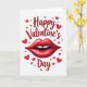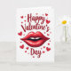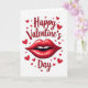 This greeting card features a white background with a bright red Valentine theme. Near the top, the words “Happy Valentine’s Day” are written in red, in a smooth, flowing letter style that looks like a handwritten note. Centered below the text is a large pair of glossy red lips with small white highlights that make them look shiny. The lips are slightly open, showing a bit of white teeth, which gives the face a flirty, affectionate expression. Around the message and lips, several red hearts in different sizes are scattered like confetti, filling the space without feeling crowded. The simple red-and-white color choice keeps the focus on love and closeness, making it easy to give to a partner or a close friend 🥰. It’s a sweet way to share Valentine’s Day sentiments ❤️.