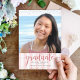 Be proud, rejoice and showcase this milestone of your favorite grad! Send out this stunning, modern, sparkly rose gold typography script against a dusty pink and white striped background with pink and gold dots, personalized photo announcement for an event to remember. Personalize the custom text with your grad’s name, school and class year. Matching invites, thank you cards, cap toppers, napkins, plates and other graduation goodies are also available in this trendy and stylish collection. Guaranteed to add stylish fun to her special occasion!
