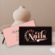 Modern, trendy Nail Technician business card features sparkly rose gold faux foil typography script ''Nails'' , set of nails on a dark grey background.