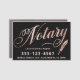 Elegant, trendy business car magnet for notary loan signing agent featuring faux foil rose gold handwritten calligraphy script ''notary'' on a black background. Personalize with your details.
