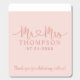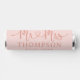 A glamorous wedding mint favor featuring "Mr and Mrs" in decorative heart script calligraphy with the couple's surname displayed as a personalized monogram centerpiece. Warm rose gold tones on a soft pink background create a romantic, metallic blush elegance. Personalize the names and wedding date for a sweet reception treat. All text is fully editable.