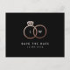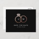 A modern monogram gets glam with intertwined faux rose gold wedding rings and simple personalized text making this save the date postcard a new classic with streamlined text in soft dusty rose on classic black. Personalize all of the text of this minimal save the date and add an engagement photo for a pared down and simple look all while directing your guests to save the date for your big day.