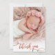Modern Elegant Chic Calligraphy Rose Gold Script Photo Newborn Baby Girl Thank You Card. Features a pretty "thank you" text in a handwritten swash tail font calligraphy script in blush pink rose gold faux foil. At the back side pre-made personal message. Great for baby girl. Easy to personalize with your baby photo and details.