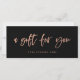 This modern small business gift certificate features faux rose gold trendy casual script typography that says "a gift for you," on a dark black background.