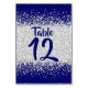 This modern table number card has a silver glitter effect on a deep royal blue background. You can change the font style and color and also add each table number individually by going to the customize menu. This is part of a wedding suite with a matching menu, place cards and other essentials.