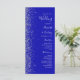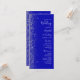 The left-hand edge of this elegant modern wedding program features a silver faux glitter design. The customizable text combines white handwriting, copperplate and italic fonts on a royal blue background.