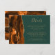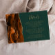 The left-hand edge of this elegant modern wedding details enclosure card features a watercolor agate border in shades of rust and burnt orange, trimmed with faux gold glitter. The text is in gold-colored handwriting script and copperplate font on a hunter green background. The reverse side features a matching rust and gold agate design.