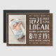 Affordable custom printed baby birth announcement photo magnets. This modern rustic design features a trendy typography layout personalized with baby's birth stats and newborn photo on a faux wood background. Use the design tools to edit the text fonts and colors, add more photos and create a unique one of a kind magnetic birth announcement for your new baby boy.