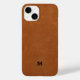 Simple Modern Brushed Metallic Gold Monogram Emblem Sable Brown Leather Look Texture Phone Case. Elegant brushed metallic gold monogram emblem with monogrammed initial in modern typography on sable brown faux leather textured background.
