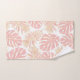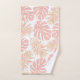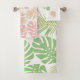 Modern sage green and pink tropical leaves Bath Towel Set. This stunning bath towel set features a contemporary combination of sage green and pink, adorned with a vibrant tropical design. The design showcases elegant monstera and palm leaves, outlined in a luxurious gold hue. The bath towel itself boasts a soothing sage green color, while the hand towel adds a pop of playful pink. To add a personal touch, the wash cloth is customized with your monogram and a charming tropical leaf motif. This set is the perfect addition to any bathroom, bringing a touch of nature and elegance to your daily routine.
