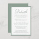 This wedding details card showcases “Details” in soft sage green calligraphy with coordinating serif text below for your hotel, reception, and website details. The sage green border adds a fresh, botanical touch while maintaining a clean and modern layout. Ideal for garden, estate, vineyard, and garden weddings, this design blends natural elegance with classic typography for a look that feels calm, romantic, and thoughtfully curated.