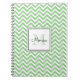 Personalized spiral notebook features a trendy sage green chevron pattern with custom name in black handwriting font and monogram in matching sage green in white square frame.