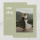 Modern Sage Green Wedding Elopement Reception Invitation. Customize with a favorite wedding photo, bride and groom names, and your wedding date on the front, and add your 'we eloped' message and reception invite info to the back of this elegant and minimalistic sage green wedding announcement card and party invitation.