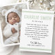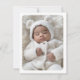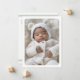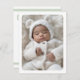 White or any color birth announcement thank you card with your custom photo on the front. Customizable message on the back with light sage green borders top and bottom. You can change all colors, move and resize elements with the design tool.