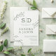 Bold and modern wedding invitation featuring three foliage line drawing and some monograms on an off white background. The couples monograms also appear on the back of the invitation on a sage background.