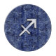 A silver chrome like Sagittarius zodiac symbol on a vibrant navy blue digital camouflage design texture print background. A modern urban racy design for a great custom birthday gift idea.