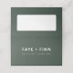 Simple, stylish custom wedding place card in a modern minimalist scandi scandinavian design style with a contemporary typography in white on a moss forest green background in an informal casual style. The text can easily be personalized for a unique one of a kind wedding design for your special day.