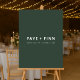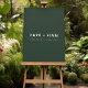Simple, stylish custom wedding easel foam board sign in a modern minimalist scandi scandinavian design style with a contemporary typography in white on a moss forest green background in an informal casual style. The text can easily be personalized for a unique one of a kind wedding favor for your special day.
