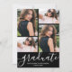 Add your favorite four photos to the front of these graduation announcement party invitations featuring graduate and class of in chic lettering on a black school color background. MORE designs and colors done in our store including invitations, save the date cards and postcards.