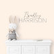 Personalized bedroom nursery wall stickers, featuring your second name in gray capital letters and your first name in black, using an elegant script font. All font styles and colors can be changed by clicking on the customize further link after personalizing.