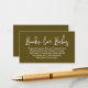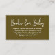 Elevate your baby shower with our "Modern Script brown Baby Shower Book Request Enclosure Card". This elegant card features a contemporary script font in soothing sage green, adding a touch of sophistication to your event. Encourage guests to bring books instead of cards by including this enclosure card with your invitations.