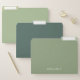 A set of personalized file folders, with modern calligraphy script, in different shades of shade green like dark sage and light sage green. Customize it with your own name, business name, date or text of choice.