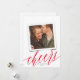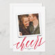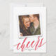This modern yet elegant new year's photo card features a large script "cheers" in red over a classic white background with a single square photo. Over the photo is a faux photo frame image - actual design is not 3D. On the back of the card is the same white color. **ALL colors are customizable - background color, text color, even the calligraphy script color! Just click "customize design further" in the dropdown menu.**