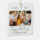 This modern script photo Happy Holidays ornament features two of your favorite photos (on the front and back) of your family as well as your family name and date. Space for more text on the back.