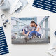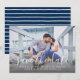 A sleek and contemporary save the date featuring flowing white lowercase calligraphy script overlaid across a full-bleed landscape engagement photo. The navy blue striped backing adds a crisp, nautical-inspired contrast that coordinates beautifully with navy or classic wedding color palettes. All text including names, date, and location is fully customizable.