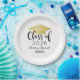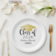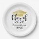Custom paper graduation plates feature a modern and elegant personalized design with the graduate's name, their class year in trendy black calligraphy script, a gold colored grad cap motif, and scroll accent.