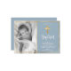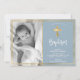 Simple Elegant Gold Cross Dusty Blue christening and baptism Photo Invitation. Send to family and friends with this modern personalized religious flat card. It features hand lettered ”Baptism” script, around double faux gold foil frame on light dusty blue background.