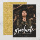 Simple graduation announcement featuring the graduate's photo with "graduate" in a trendy white script font. Personalize the front of the photo graduation announcement by adding the graduate's name, school name, and graduation year. The announcement reverses to display a pattern of white sprinkles with a gold background or color of your choice.