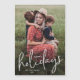 A Modern Script Happy Holidays Simple Photo Holiday Magnetic Card with handwritten font full bleed portrait photo on the front with family name. The back is a magnet. Click the edit button to customize this design.