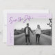 Modern and stylish save the date card featuring a hand lettered script text that says "save the date." One photo in the font and one on the back. The background is lilac.