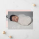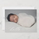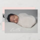 Birth announcement featuring a modern script Hello overlapping the photo. The back allows for three extra photos and a message with an editable background color.