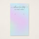 Modern earring holder card featuring a colorful holographic gradient in pastel pink, purple, blue and green. The front has your business name and tagline and the back has your contact information. These pretty and feminine earring display cards are perfect for a handmade jewelry business.