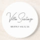 A personalized sandstone coaster featuring a custom home or villa name in elegant calligraphy script with a location line beneath. The clean white background with delicate green botanical wreath accent creates a chic, modern aesthetic. Perfect for vacation homes, rental properties, or as a sophisticated housewarming gift. Coordinates with matching Chic Script Home Residence Name Monogram collection pieces. All text is fully customizable.