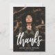 Trendy graduation thank you cards featuring the graduate's photo with "thanks" in white script lettering. Personalize the front of the card by adding the graduate's name and graduation year. The photo graduation thank you card reverses to display your typed or handwritten message with a maroon and white sprinkle background.