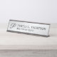 This desk name plate features monogram in black modern script font style with name and title in black professional serif font style on silver background.