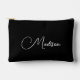 This accessory pouch can serve as an everyday accessory or makeup bag, OR Gift your maid of honor, bridesmaids, flower girl, mother of the bride, and mother in law, a simple, minimalist stylish toiletries, makeup bag. White script name on black. This style with name only, for everyday use.