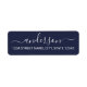 This return address label features personalized family name in white modern script font with address in white modern sans serif font on navy blue background.